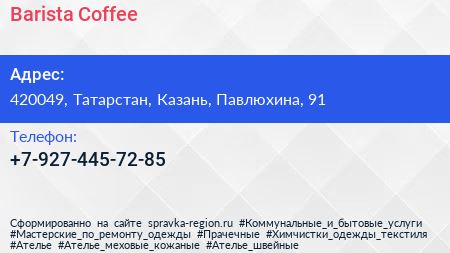 Barista Coffee по адресу 420049, Татарстан, Казань, Павлюхина, 91 в дальнейшем Организация, размещена в следующих категориях: