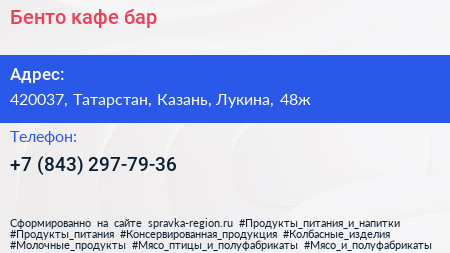 Бенто, кафе-бар по адресу 420037, Татарстан, Казань, Лукина, 48ж в дальнейшем Организация, размещена в следующих категориях:
