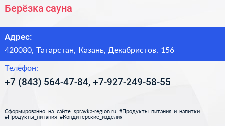 Берёзка, сауна по адресу 420080, Татарстан, Казань, Декабристов, 156 в дальнейшем Организация, размещена в следующих категориях: