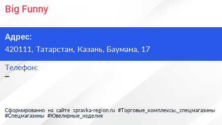 Big-Funny по адресу 420111, Татарстан, Казань, Баумана, 17 в дальнейшем Организация, размещена в следующих категориях: