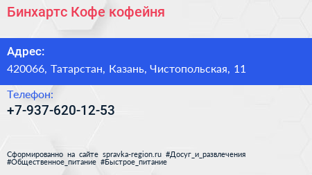 Бинхартс Кофе, кофейня по адресу 420066, Татарстан, Казань, Чистопольская, 11 в дальнейшем Организация, размещена в следующих категориях: