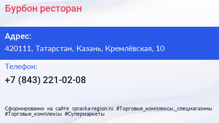 Бурбон, ресторан по адресу 420111, Татарстан, Казань, Кремлёвская, 10 в дальнейшем Организация, размещена в следующих категориях: