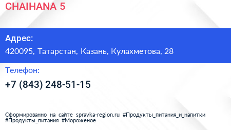 CHAIHANA №5 по адресу 420095, Татарстан, Казань, Кулахметова, 28 в дальнейшем Организация, размещена в следующих категориях: