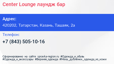 Center Lounge, лаундж-бар по адресу 420202, Татарстан, Казань, Ташаяк, 2а в дальнейшем Организация, размещена в следующих категориях: