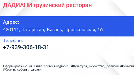 ДАДИАНИ, грузинский ресторан по адресу 420111, Татарстан, Казань, Профсоюзная, 16 в дальнейшем Организация, размещена в следующих категориях: