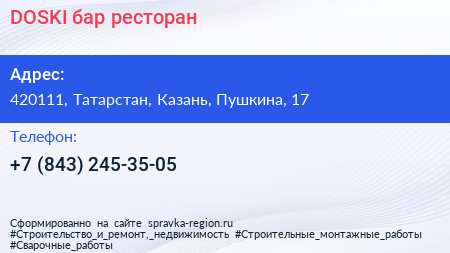 DOSKI, бар-ресторан по адресу 420111, Татарстан, Казань, Пушкина, 17 в дальнейшем Организация, размещена в следующих категориях: