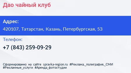 Дао, чайный клуб по адресу 420107, Татарстан, Казань, Петербургская, 53 в дальнейшем Организация, размещена в следующих категориях: