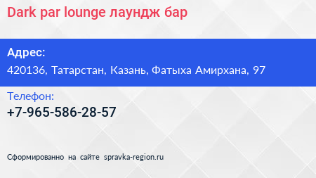 Dark par lounge, лаундж-бар по адресу 420136, Татарстан, Казань, Фатыха Амирхана, 97 в дальнейшем Организация, размещена в следующих категориях: