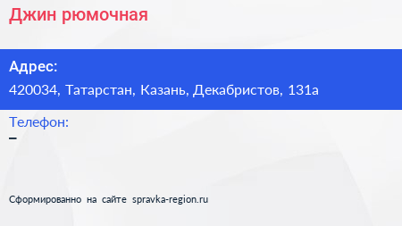 Джин, рюмочная по адресу 420034, Татарстан, Казань, Декабристов, 131а в дальнейшем Организация, размещена в следующих категориях: