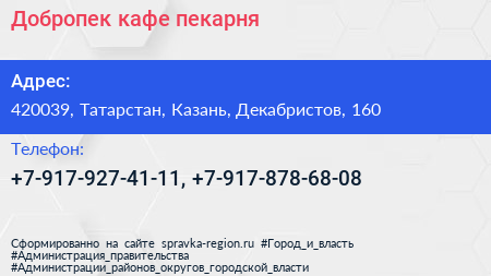Добропек, кафе-пекарня по адресу 420039, Татарстан, Казань, Декабристов, 160 в дальнейшем Организация, размещена в следующих категориях: