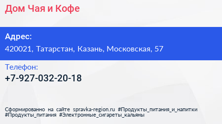 Дом Чая и Кофе по адресу 420021, Татарстан, Казань, Московская, 57 в дальнейшем Организация, размещена в следующих категориях: