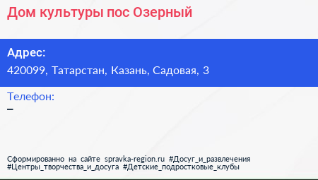 Дом культуры, пос. Озерный по адресу 420099, Татарстан, Казань, Садовая, 3 в дальнейшем Организация, размещена в следующих категориях: