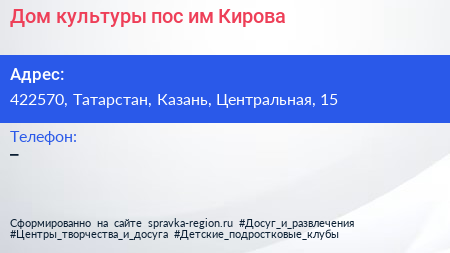 Дом культуры, пос. им. Кирова по адресу 422570, Татарстан, Казань, Центральная, 15 в дальнейшем Организация, размещена в следующих категориях: