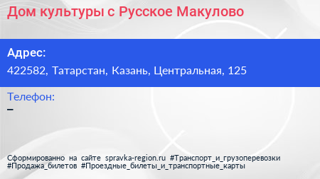 Дом культуры, с. Русское Макулово по адресу 422582, Татарстан, Казань, Центральная, 125 в дальнейшем Организация, размещена в следующих категориях: