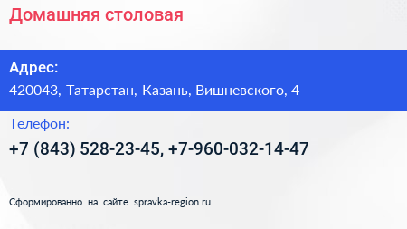 Домашняя столовая по адресу 420043, Татарстан, Казань, Вишневского, 4 в дальнейшем Организация, размещена в следующих категориях: