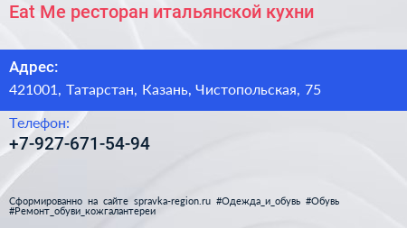 Eat Me, ресторан итальянской кухни по адресу 421001, Татарстан, Казань, Чистопольская, 75 в дальнейшем Организация, размещена в следующих категориях: