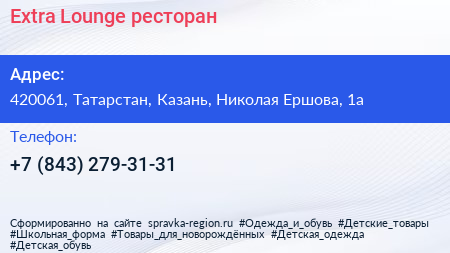 Extra Lounge, ресторан по адресу 420061, Татарстан, Казань, Николая Ершова, 1а в дальнейшем Организация, размещена в следующих категориях: