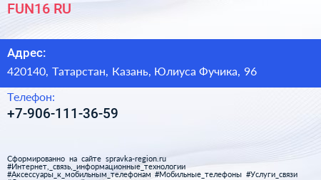FUN16.RU по адресу 420140, Татарстан, Казань, Юлиуса Фучика, 96 в дальнейшем Организация, размещена в следующих категориях: