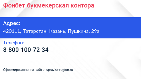 Фонбет, букмекерская контора по адресу 420111, Татарстан, Казань, Пушкина, 29а в дальнейшем Организация, размещена в следующих категориях: