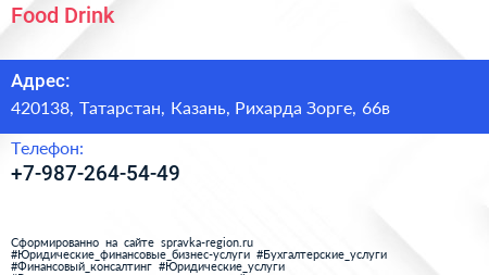 Food & Drink по адресу 420138, Татарстан, Казань, Рихарда Зорге, 66в в дальнейшем Организация, размещена в следующих категориях: