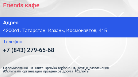 Friends, кафе по адресу 420061, Татарстан, Казань, Космонавтов, 41Б в дальнейшем Организация, размещена в следующих категориях: