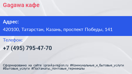 Gagawa, кафе по адресу 420100, Татарстан, Казань, проспект Победы, 141 в дальнейшем Организация, размещена в следующих категориях: