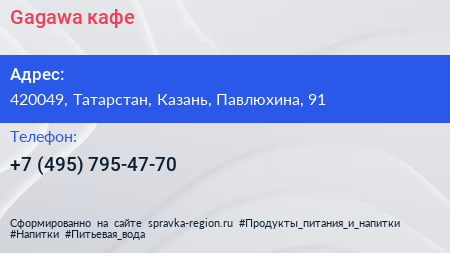 Gagawa, кафе по адресу 420049, Татарстан, Казань, Павлюхина, 91 в дальнейшем Организация, размещена в следующих категориях: