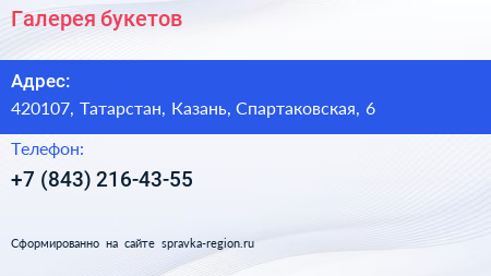 Галерея букетов по адресу 420107, Татарстан, Казань, Спартаковская, 6 в дальнейшем Организация, размещена в следующих категориях: