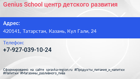 Genius School, центр детского развития по адресу 420141, Татарстан, Казань, Кул Гали, 24 в дальнейшем Организация, размещена в следующих категориях: