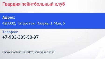 Гвардия, пейнтбольный клуб по адресу 420032, Татарстан, Казань, 1 Мая, 5 в дальнейшем Организация, размещена в следующих категориях:
