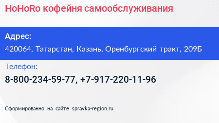 HoHoRo, кофейня самообслуживания по адресу 420064, Татарстан, Казань, Оренбургский тракт, 209Б в дальнейшем Организация, размещена в следующих категориях: