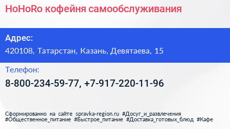 HoHoRo, кофейня самообслуживания по адресу 420108, Татарстан, Казань, Девятаева, 15 в дальнейшем Организация, размещена в следующих категориях: