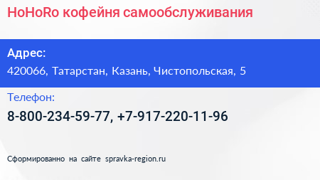 HoHoRo, кофейня самообслуживания по адресу 420066, Татарстан, Казань, Чистопольская, 5 в дальнейшем Организация, размещена в следующих категориях: