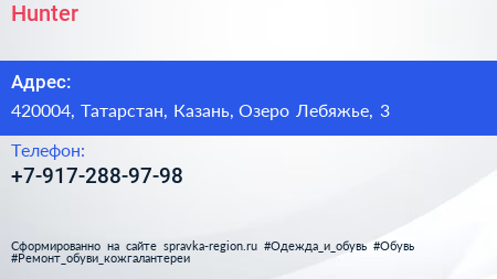 Hunter по адресу 420004, Татарстан, Казань, Озеро Лебяжье, 3 в дальнейшем Организация, размещена в следующих категориях: