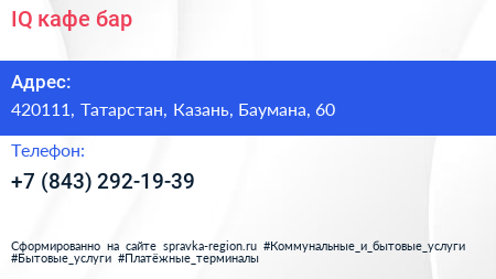 IQ, кафе-бар по адресу 420111, Татарстан, Казань, Баумана, 60 в дальнейшем Организация, размещена в следующих категориях: