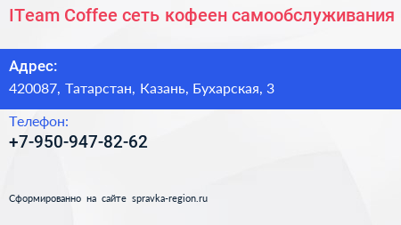 ITeam Coffee, сеть кофеен самообслуживания по адресу 420087, Татарстан, Казань, Бухарская, 3 в дальнейшем Организация, размещена в следующих категориях: