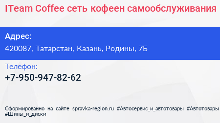 ITeam Coffee, сеть кофеен самообслуживания по адресу 420087, Татарстан, Казань, Родины, 7Б в дальнейшем Организация, размещена в следующих категориях:
