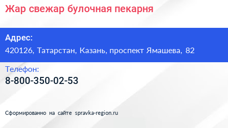 Жар свежар, булочная-пекарня по адресу 420126, Татарстан, Казань, проспект Ямашева, 82 в дальнейшем Организация, размещена в следующих категориях: