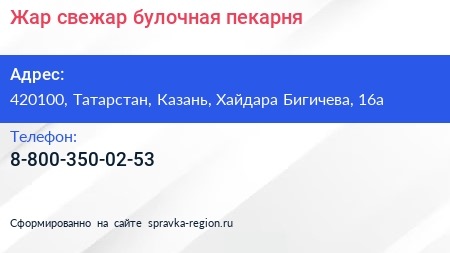 Жар свежар, булочная-пекарня по адресу 420100, Татарстан, Казань, Хайдара Бигичева, 16а в дальнейшем Организация, размещена в следующих категориях: