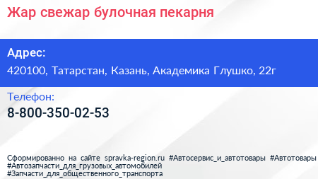 Жар свежар, булочная-пекарня по адресу 420100, Татарстан, Казань, Академика Глушко, 22г в дальнейшем Организация, размещена в следующих категориях: