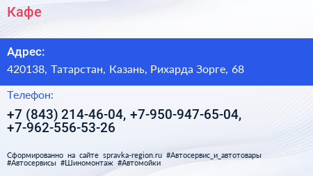 Кафе по адресу 420138, Татарстан, Казань, Рихарда Зорге, 68 в дальнейшем Организация, размещена в следующих категориях: