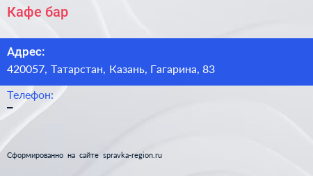Кафе-бар по адресу 420057, Татарстан, Казань, Гагарина, 83 в дальнейшем Организация, размещена в следующих категориях: