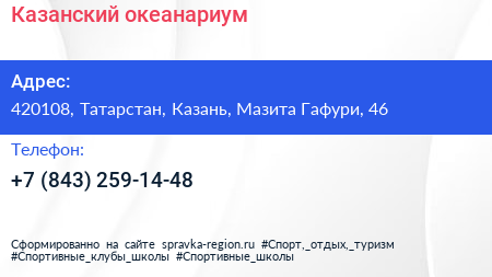 Казанский океанариум по адресу 420108, Татарстан, Казань, Мазита Гафури, 46 в дальнейшем Организация, размещена в следующих категориях: