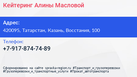 Кейтеринг Алины Масловой по адресу 420095, Татарстан, Казань, Восстания, 100 в дальнейшем Организация, размещена в следующих категориях: