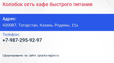 Колобок, сеть кафе быстрого питания по адресу 420087, Татарстан, Казань, Родины, 11а в дальнейшем Организация, размещена в следующих категориях: