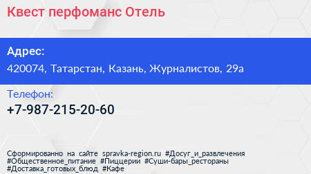 Квест-перфоманс Отель по адресу 420074, Татарстан, Казань, Журналистов, 29а в дальнейшем Организация, размещена в следующих категориях: