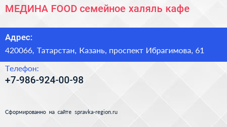 МЕДИНА FOOD, семейное халяль-кафе по адресу 420066, Татарстан, Казань, проспект Ибрагимова, 61 в дальнейшем Организация, размещена в следующих категориях: