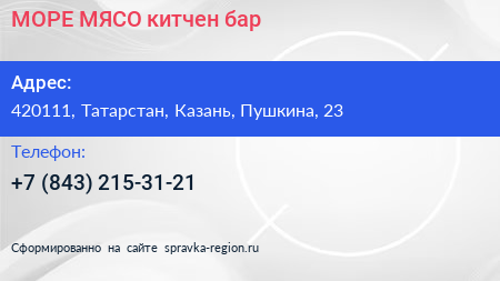 МОРЕ & МЯСО, китчен-бар по адресу 420111, Татарстан, Казань, Пушкина, 23 в дальнейшем Организация, размещена в следующих категориях: