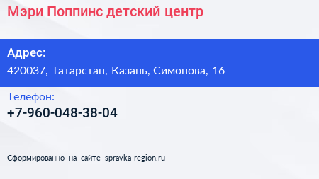 Мэри Поппинс, детский центр по адресу 420037, Татарстан, Казань, Симонова, 16 в дальнейшем Организация, размещена в следующих категориях: