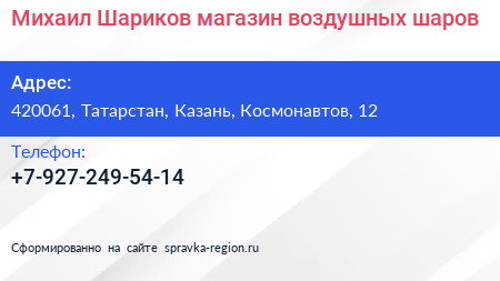 Михаил Шариков, магазин воздушных шаров по адресу 420061, Татарстан, Казань, Космонавтов, 12 в дальнейшем Организация, размещена в следующих категориях:
